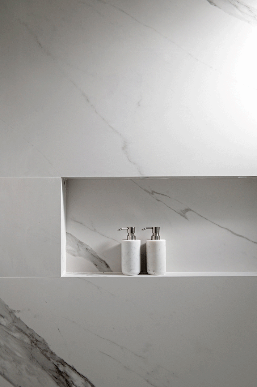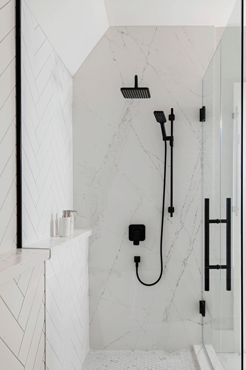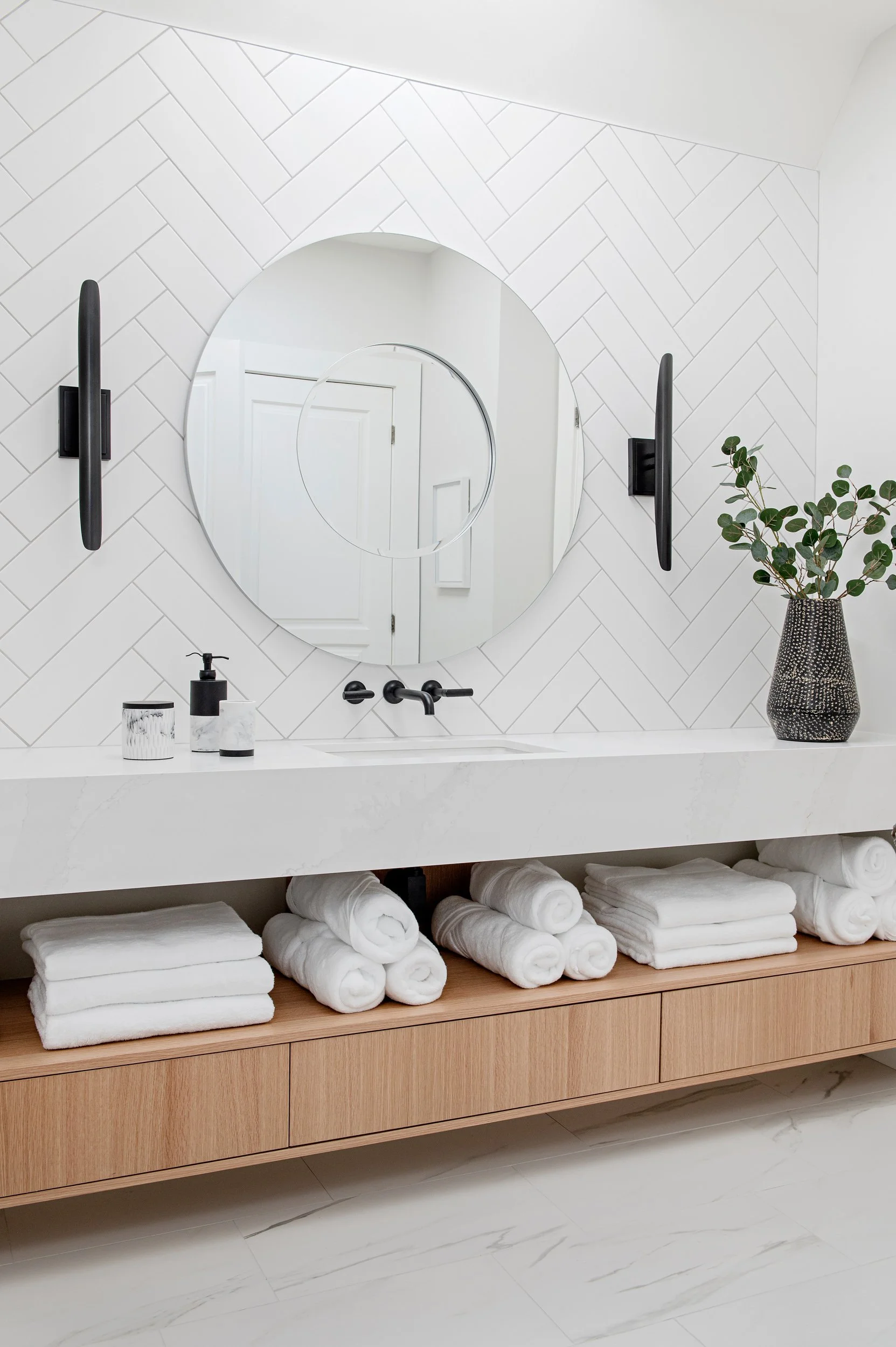 In the secondary bathroom, practicality meets style with herringbone wall tile, a custom quartz ledge, and touch-latch drawers. Each detail was thoughtfully selected to harmonize style and functionality, creating spaces that are both visually appealing and practical for everyday living.