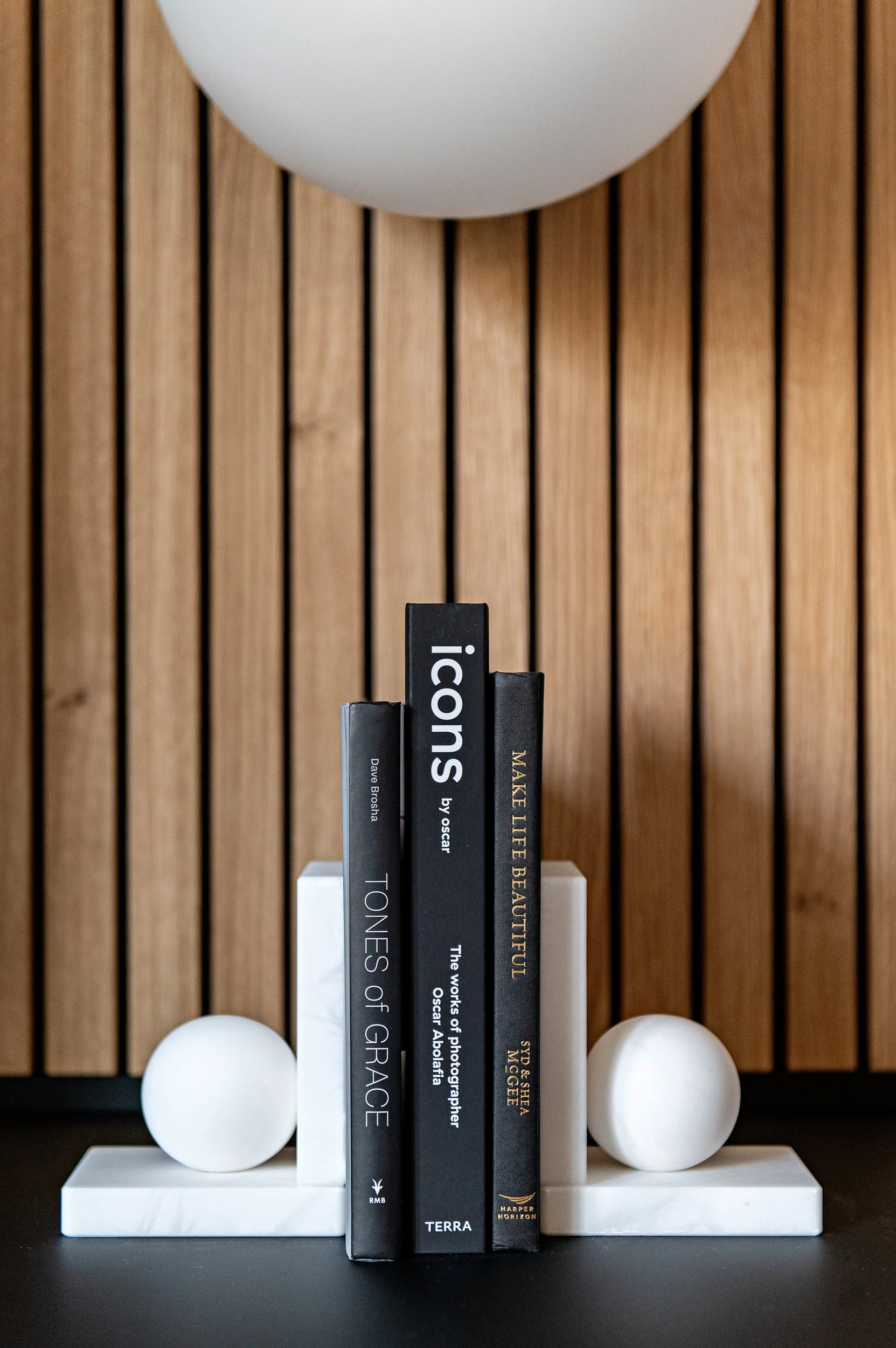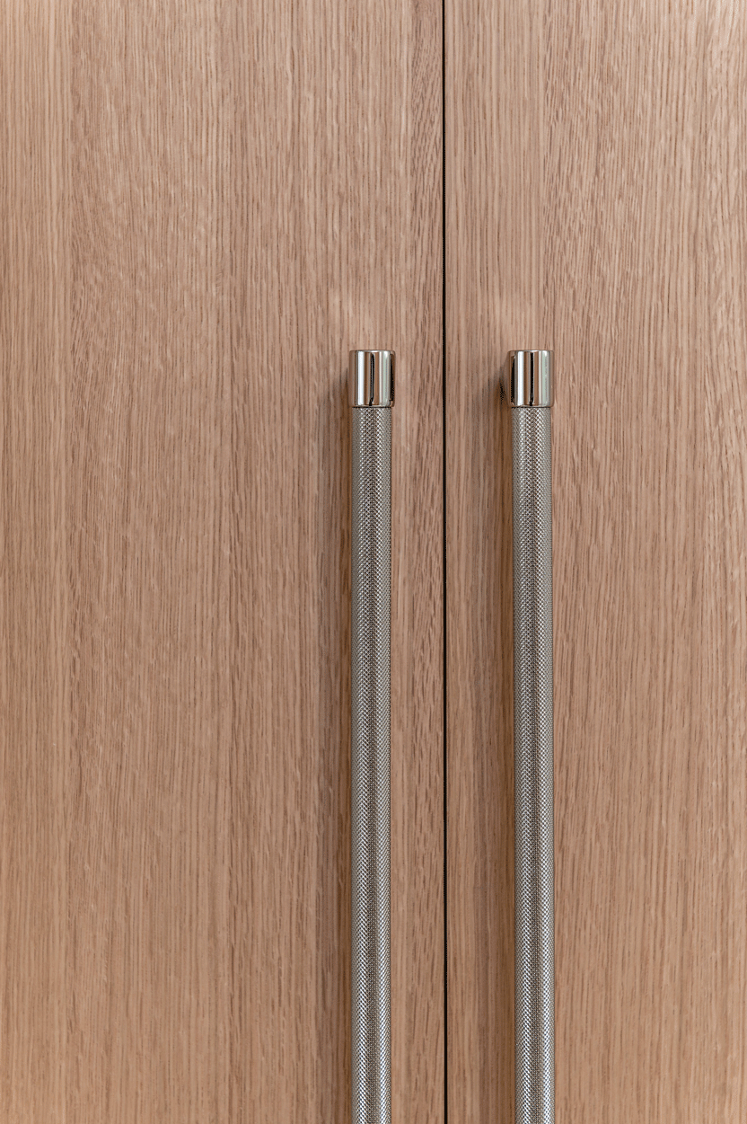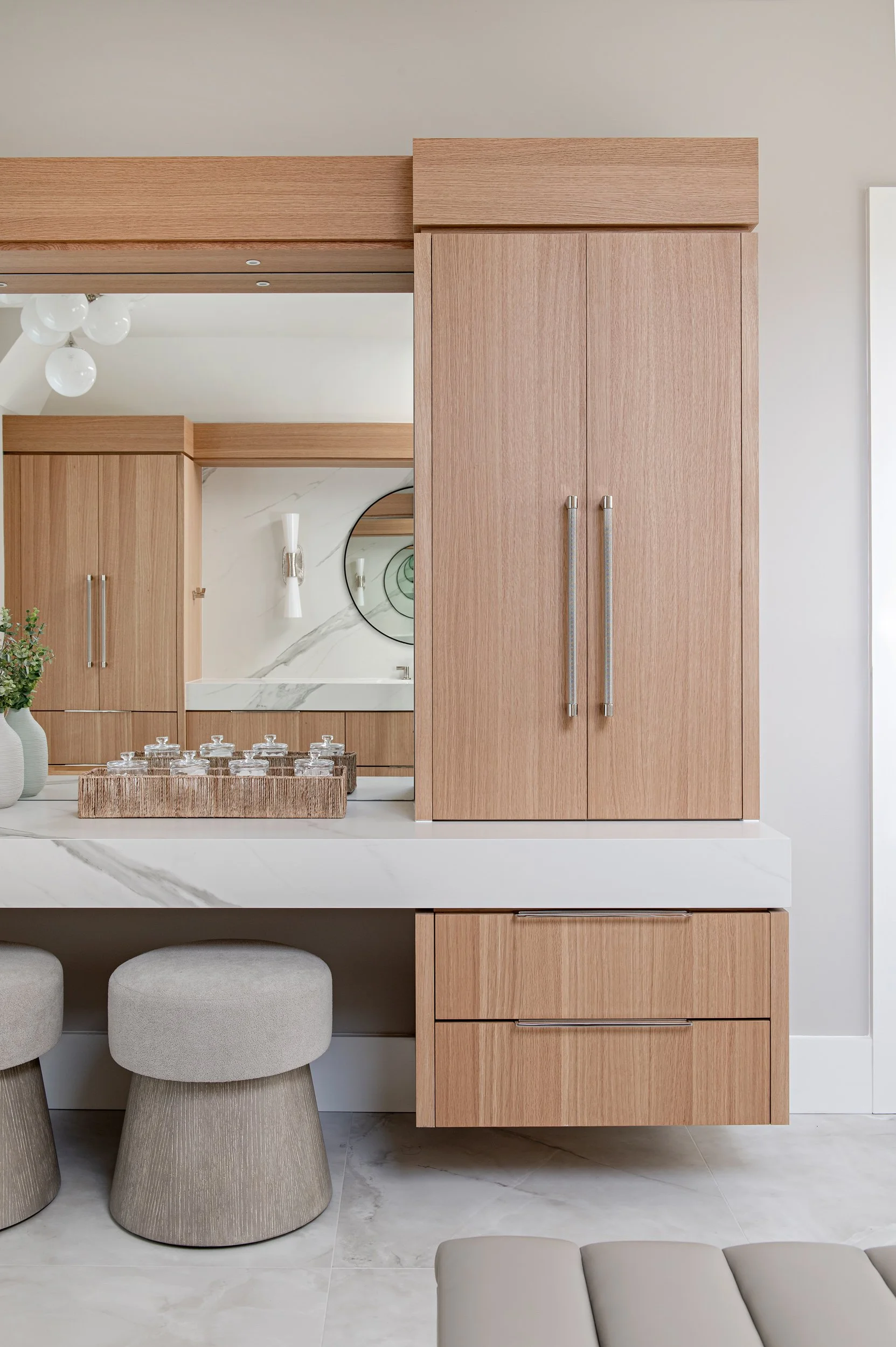 This project captures the essence of timeless elegance as it seamlessly integrates with the comfort of modern living. In the primary bedroom, we crafted custom bed and armoire units with eye-catching black built-in cabinetry and contrasting white oak slats, showcasing a striking blend of sleek modernity and natural warmth. The pièce de résistance is undoubtedly the custom channel-detailed headboard, uniting style and comfort seamlessly. Transitional wall sconces add an elegant touch to this inviting space.